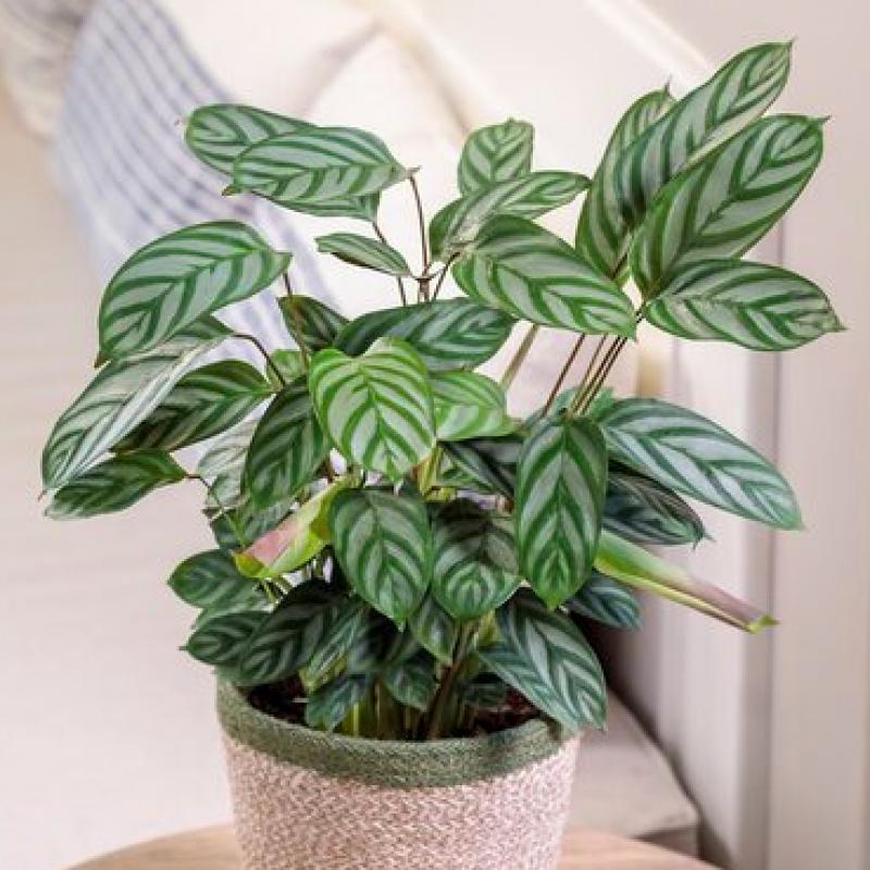 A tropical foliage plant prized for its striking silvery-green leaves marked with deep green herringbone patterns and rich purple undersides. ‘Exotica’ adds bold contrast to indoor spaces and thrives in warmth and humidity.