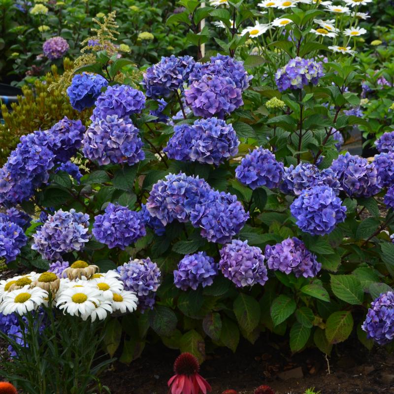 A shorter rebloomer with mophead flowers on old and new wood, this variety produces perfectly rounded blooms an average of 3.5-5" across. The intense rose-pink, violet or blue flower heads are held upright on striking red-purple stems.