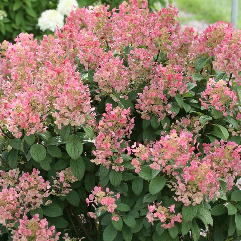Everything about this plant is a carbon copy of the original except its stature! Deep green leaves on red stems give way to bright white flowers that appear about a month before other hydrangeas are showy. The flowers are ruby red in late July-August.