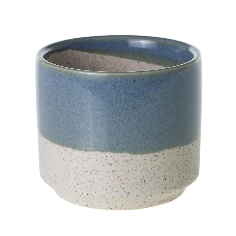 The two-toned Miguel Pot is crafted by dipping the top in glaze and layering it over a reactive glaze, resulting in a natural and striking look.