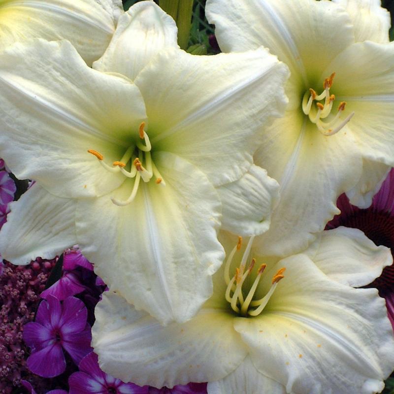 'Joan Senior' features glowing, five inch, creamy white, ruffled flowers with yellow-green throats that bloom in early to midseason.