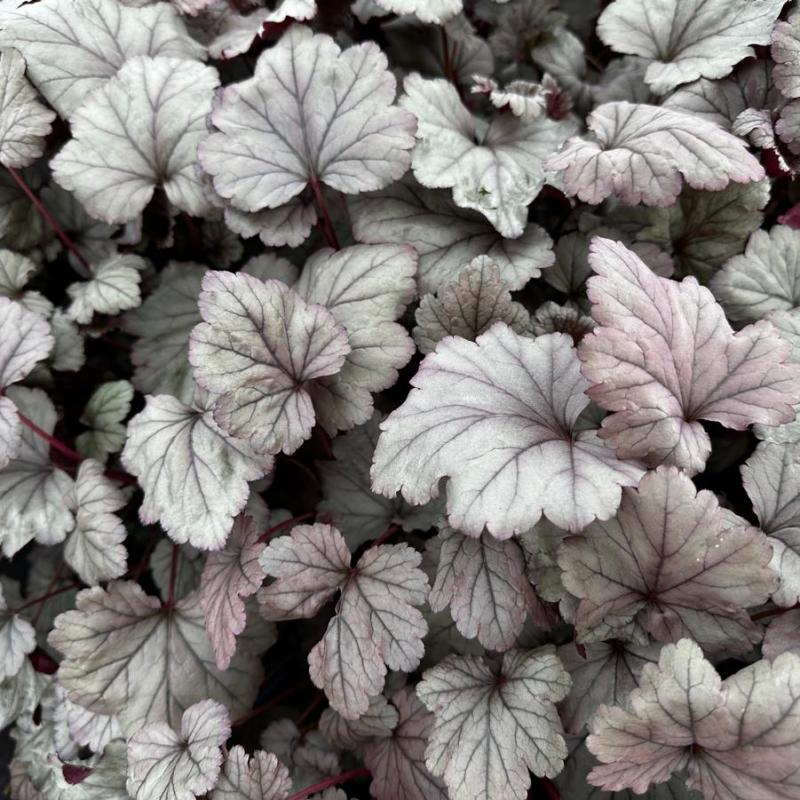 The leaves of 'Stainless Steel' emerge in spring with a silvery metallic sheen just broken by thin red-purple venation. The foliage will mature to sea foam green with mulberry purple undersides and dainty wands of white flowers appear from May to June.