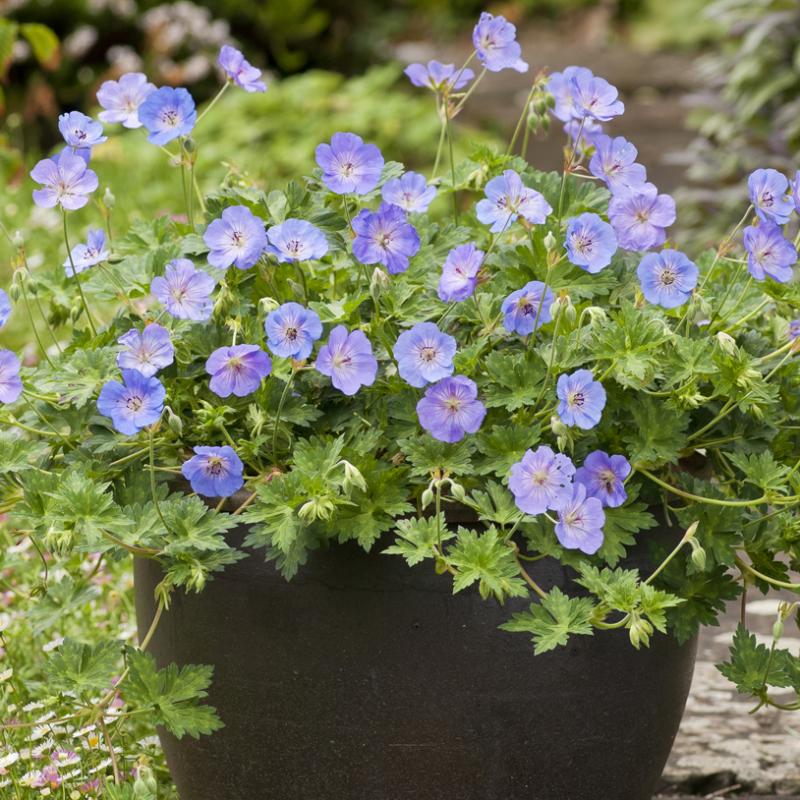 This variety produces large, light lavender blue, 2.5" flowers with lighter centers that bloom from May until frost. 'Azure Rush' is more compact than its cousin 'Rozanne', of which it shares many of the same attributes.