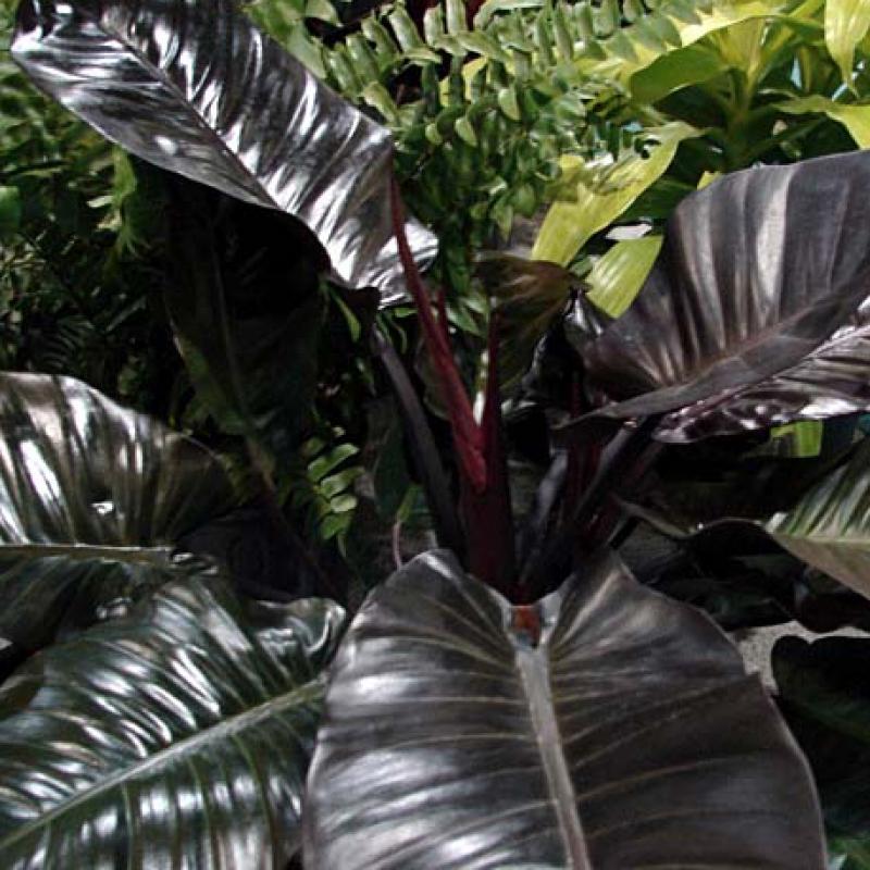 A dramatic tropical stunner with glossy, deep burgundy-black leaves and rich red stems. 'Royal Queen' makes a bold statement in modern interiors and prefers warm, humid conditions with indirect light to maintain its dark coloration.