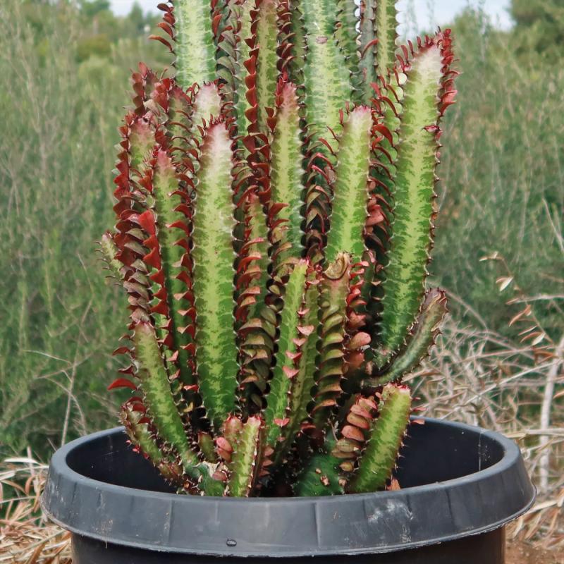 This architectural succulent features tall, upright stems with spiny ridges and ruby-red accents along its edges. 'Rubra' is a striking, low-maintenance plant perfect for sunny spots. Caution: sap is toxic and irritating to skin and pets.