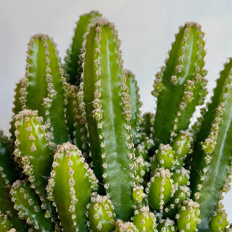 A sculptural cactus with spiny green stems that form castle-like towers. Slow-growing and ideal for sunny windowsills or desert-style arrangements. Rarely blooms indoors but adds striking architectural interest.