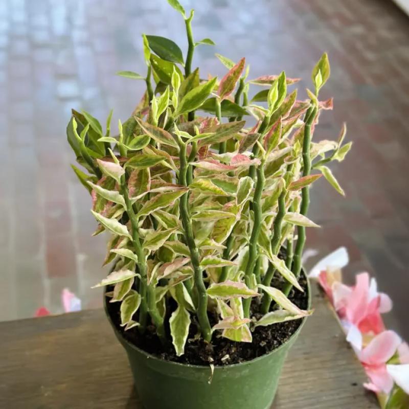 A unique succulent-like plant with upright zigzag stems and variegated green, cream, and pink leaves. Its unusual shape and colorful foliage make it a striking conversation piece indoors.