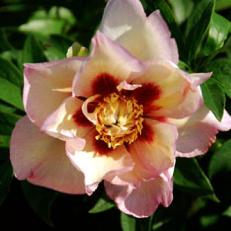 The large, multi-colored flowers of this variety have pink tinted cream petals that are accented with deep maroon flares. The flowers appear in late June amid disease resistant foliage.