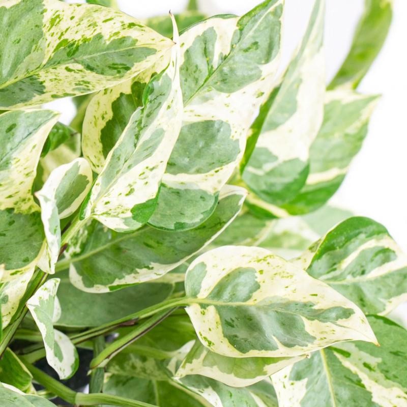 A compact pothos with beautiful variegated foliage in shades of green, white, and silver-gray. Each leaf features a unique marbled pattern, adding elegance and brightness to indoor spaces. Perfect for shelves or hanging baskets.