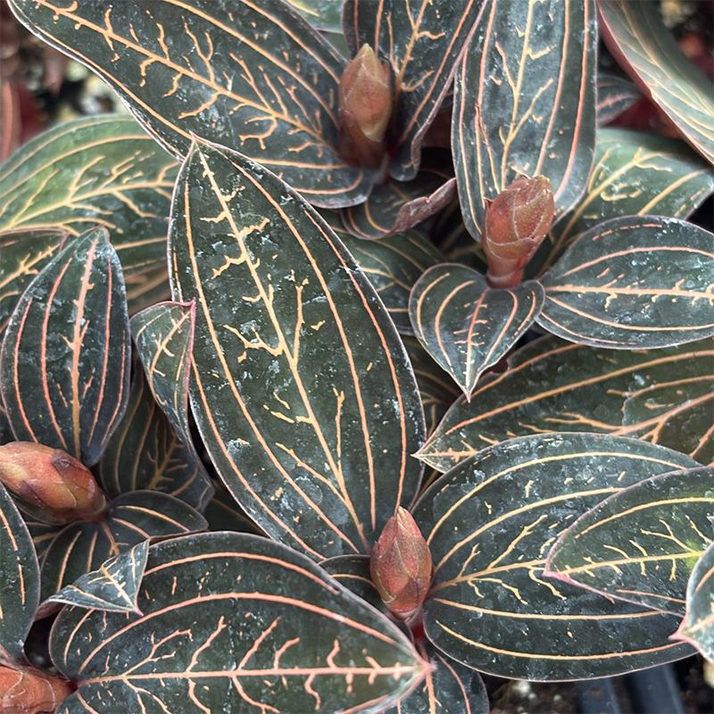 A unique, low-growing orchid prized for its velvety dark leaves with glowing copper veining. Easy to enjoy as a foliage plant, and it may reward you with small white flowers in winter.