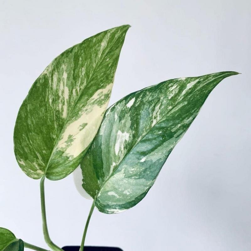 A rare and highly decorative pothos variety featuring creamy marbled variegation on lush green leaves. 'Marble' thrives in bright, filtered light and offers dramatic contrast in hanging baskets or climbing structures.
