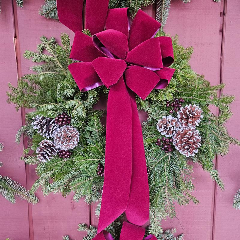 This beautiful Balsam wreath is adorned with a burgundy bow, white tipped cones, and festive berries. Perfect for adding a touch of holiday cheer to your front door or indoor space. Made with fresh, high-quality materials for a long-lasting decoration. A classic and elegant addition to your seasonal decor.