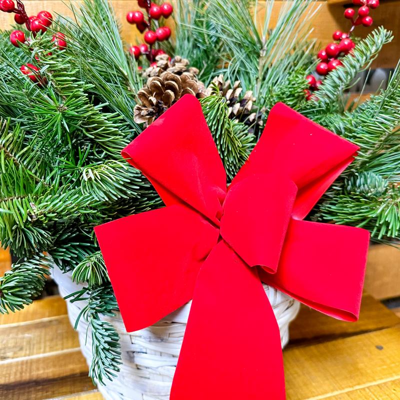 Dress up your doorstep with this charming holiday basket sporting fresh greens, festive accents and a hand-tied bow.