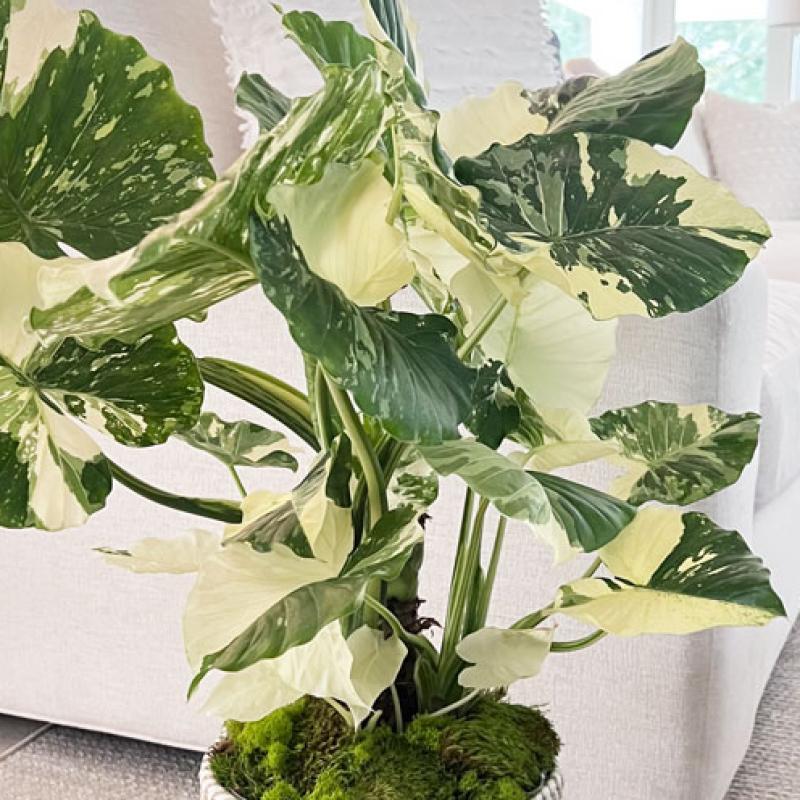 An elegant variegated Alocasia featuring broad green leaves marbled with creamy white and pale yellow. Each leaf has a unique pattern, creating a striking contrast that adds light and movement to any tropical indoor display.