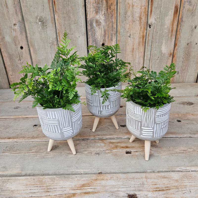 These matching footed planters stand about 5 inches tall, filled with easy to care for ferns!