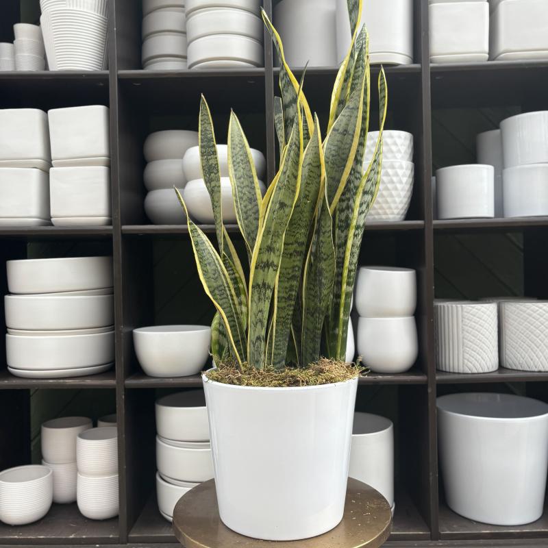 Dress up your space with a floor plant in a classic white cover pot. Actual plant will vary, our team will select a plant that will thrive in a spot with medium to bright light!